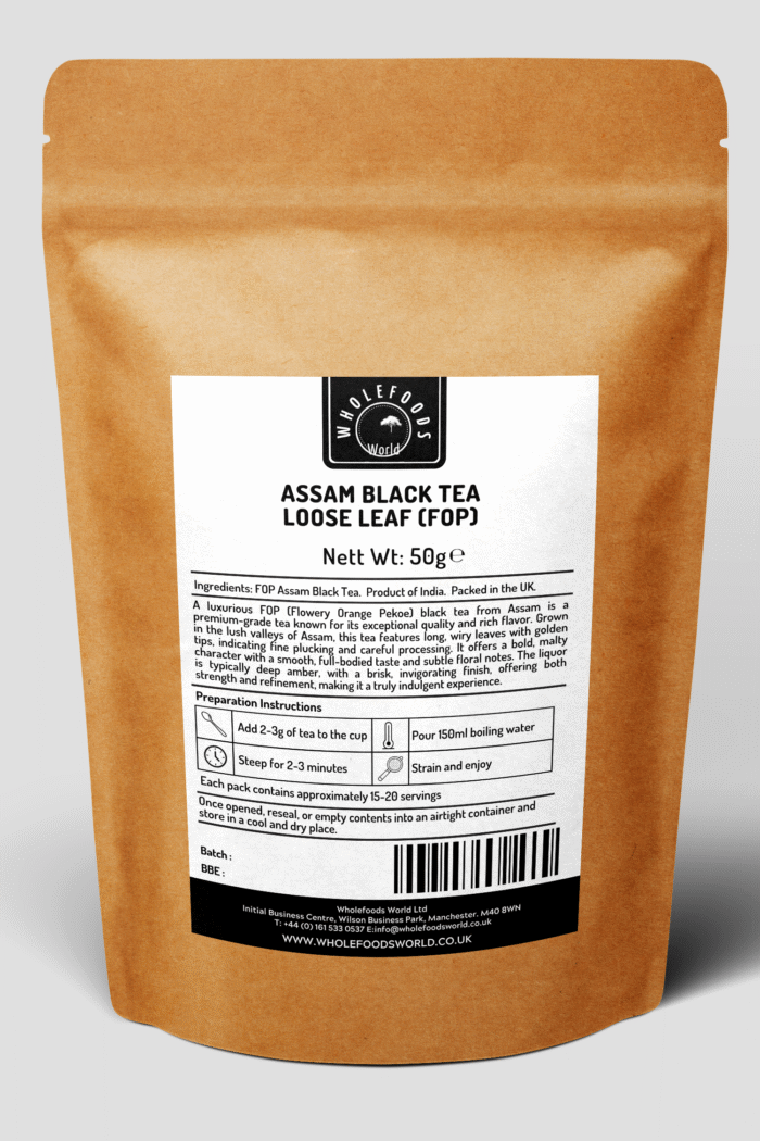 Discover the rich taste and bold character of Assam Black Tea, a classic favourite for tea lovers who enjoy a full-bodied, malty brew. Grown in the lush plains of Assam, India, this tea is renowned for its robust flavour and deep amber colour – perfect for a strong morning cup or a comforting afternoon pick-me-up. Our natural Assam tea is carefully selected and expertly packed to preserve its freshness and aroma. Free from artificial colouring or additives, it offers a pure, authentic tea experience with every cup. Whether brewed alone or blended with milk and spices for a traditional chai, this loose leaf tea delivers a satisfying depth of flavour. It comes packed in a resealable Kraft Paper Pouch, designed to maintain quality while reducing plastic waste. The packaging is environmentally friendly, offering a sustainable choice for conscious consumers. With no added ingredients making it a perfect addition to any wholesome lifestyle. Assam Black Tea is also a source of natural antioxidants, which may help support the immune system and overall wellbeing. It’s an energising yet smooth tea that complements your daily ritual — whether you enjoy it as-is or with a splash of milk. Enjoy every cup knowing you’re choosing natural quality, strong flavour, and sustainable packaging. Allergen Warning: Packed on premises that handles Mustard and may contain nuts and cereals.
