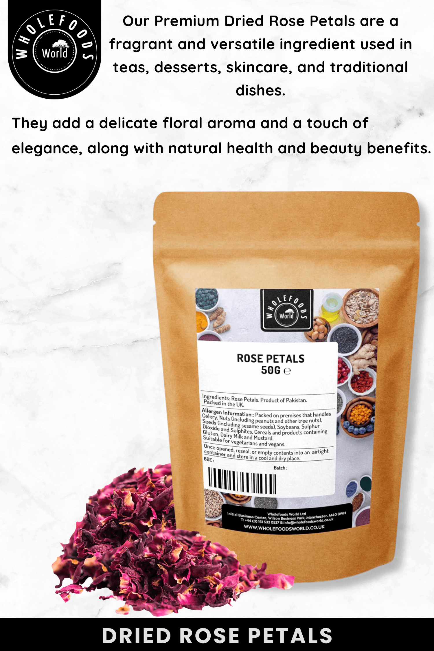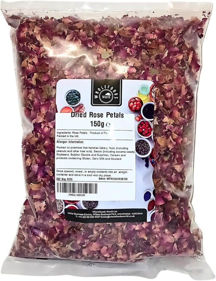 Bring natural beauty and fragrance to your recipes, crafts, and skincare with our Premium Dried Rose Petals. Carefully harvested and gently dried to preserve their vibrant colour and delicate aroma, these rose petals are a versatile addition to your home. Our rose petals are 100% natural, non-GMO, and contain no colouring, additives, or preservatives. They are ideal for use in herbal teas, bath soaks, DIY beauty products, confetti, potpourri, baking, and even decorating cakes and desserts. Their soft floral scent and gentle flavour add a luxurious, botanical touch wherever they’re used. Our rose petals are sealed in a resealable Kraft Paper Pouch to lock in freshness and protect against moisture. The packaging is environmentally friendly, made with sustainability in mind and designed to reduce plastic use in your home. These rose petals are suitable for vegetarians and vegans, free from any animal products or synthetic ingredients. Whether you’re crafting, relaxing, or creating elegant desserts, you can enjoy peace of mind knowing you’re using a clean, ethical product. Perfect for weddings, skincare, herbal infusions, and romantic décor, our Premium Dried Rose Petals offer a beautiful way to connect with nature while supporting sustainable living.
