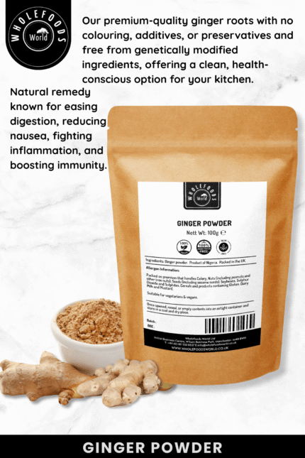 Bring warmth and zest to your kitchen with our Premium Ginger Powder, a flavourful and aromatic spice essential for both cooking and wellness. This finely ground ginger is sourced from high-quality roots and carefully packed in the UK, ensuring purity, freshness, and exceptional taste in every pouch. Made with natural, non-GMO ingredients, our ginger powder is completely free from artificial colouring, additives, or preservatives. Its bold flavour profile makes it ideal for baking, cooking, brewing teas, or creating homemade remedies. Whether you’re preparing a spicy stir-fry, a comforting ginger tea, or a sweet treat, our versatile ginger powder delivers consistently outstanding results. Packaged in a resealable Kraft paper pouch, this product not only keeps your spice fresh but also supports an environmentally friendly lifestyle. The packaging is plastic-free, recyclable, and designed to reduce waste while preserving quality. Our ginger powder is suitable for vegetarians and vegans, making it the perfect addition to plant-based diets and conscious cooking. With its traditional use in supporting digestion, warming the body, and boosting flavour, ginger continues to be a pantry staple around the world.