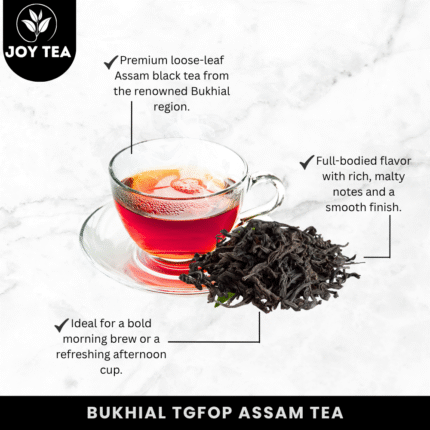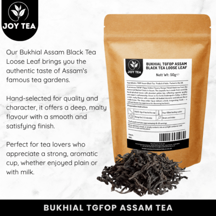 Indulge in the bold and distinctive taste of Bukhial TGFOP Assam Loose Leaf Tea, a premium-grade black tea grown on the southern banks of the Brahmaputra River near Nagaland. Known for its abundance of golden tips, TGFOP stands for “Tippy Golden Flowery Orange Pekoe” – a mark of high quality and refined flavour. This exceptional second flush tea is handpicked in summer, when the tea bushes yield their most flavourful leaves. The traditional oxidation process transforms the freshly picked green leaves into deep brown, aromatic leaves bursting with malty character. Once dried and sorted, the result is a tea with bright amber colour, rich mouthfeel, and smooth finish. Grown in lower rainfall areas, the tea bushes develop slowly, enhancing the depth and complexity of the final cup. With a balance of strength and aroma, this tea is ideal for those who appreciate a robust, full-bodied brew that holds its own with or without milk. More than just flavour, Bukhial Assam tea offers natural health benefits. It’s rich in antioxidants (polyphenols) that may help reduce the risk of heart disease, support gut health, lower blood pressure, and aid in weight management. Its moderate caffeine content delivers a gentle energy boost to keep you focused and alert. Expertly packed in a resealable Kraft Paper Pouch, this loose leaf tea remains fresh and aromatic while supporting eco-friendly packaging practices. No artificial colours, flavours, or preservatives—just pure, natural tea the way it’s meant to be enjoyed.