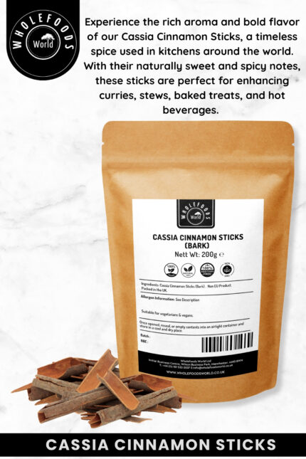 To ensure maximum freshness and aroma, our cassia cinnamon sticks are packed in the UK in a resealable Kraft Paper Pouch. This eco-friendly packaging helps retain natural oils and fragrance while reducing plastic waste – a sustainable choice for your pantry.