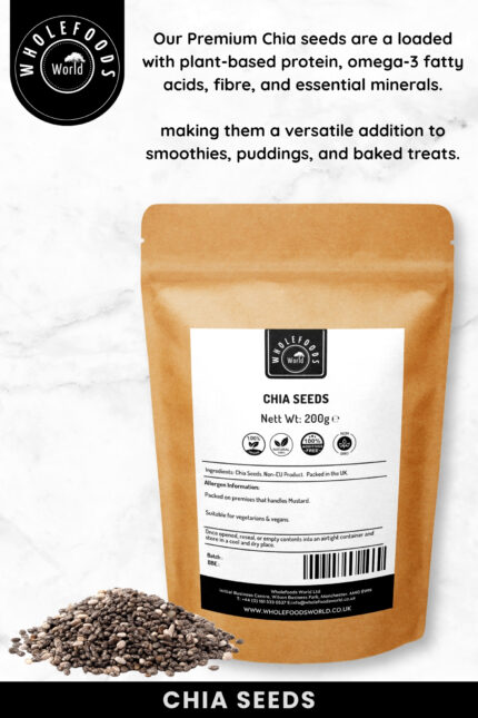 Chia seeds are packed with plant-based protein, fibre, and omega-3 fatty acids. Our chia seeds are 100% natural and non-GMO, with no added preservatives, or additives. Their mild, neutral taste allows them to blend seamlessly into both sweet and savoury recipes. Perfect for sprinkling over cereal, porridge, yoghurt, and salads, they can also be soaked in water or milk to create chia pudding, added to smoothies, or used as an egg replacement in vegan baking. Each batch is sealed in a resealable Kraft Paper Pouch. This environmentally friendly packaging helps reduce plastic waste while keeping your chia seeds fresh for longer. Naturally suitable for vegetarians and vegans, chia seeds are an ideal pantry staple for those following plant-based diets.
