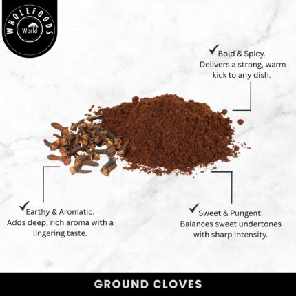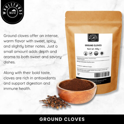 Elevate your culinary creations with the warm, bold flavour of Natural Ground Cloves – a richly aromatic spice known for its intense depth and versatility. Carefully ground from whole clove buds, our clove powder is bursting with flavour, ideal for both sweet and savoury dishes. This fine, reddish-brown powder adds a distinctive warmth to festive baking, curries, stews, spice rubs, and mulled drinks. It’s a key ingredient in spice blends like garam masala and pumpkin spice, and it pairs beautifully with cinnamon, nutmeg, and cardamom. Whether you’re seasoning meat, flavouring sauces, or adding to desserts, our ground cloves offer the convenience of a ready-to-use, flavour-packed spice. Bring warmth, fragrance, and flavour to your recipes with our premium Ground Cloves – an essential pantry staple for inspired and eco-conscious cooking. To preserve its natural oils and aroma, our ground cloves are packed in a resealable Kraft Paper Pouch – a thoughtful, environmentally friendly packaging solution. The pouch not only keeps your spice fresh for longer but also reduces plastic waste in the kitchen. Our clove powder is non-GMO, natural, and contains no colouring, preservatives, or additives. It is also suitable for vegetarians and vegans, making it a clean-label choice for home cooks and professional chefs alike.